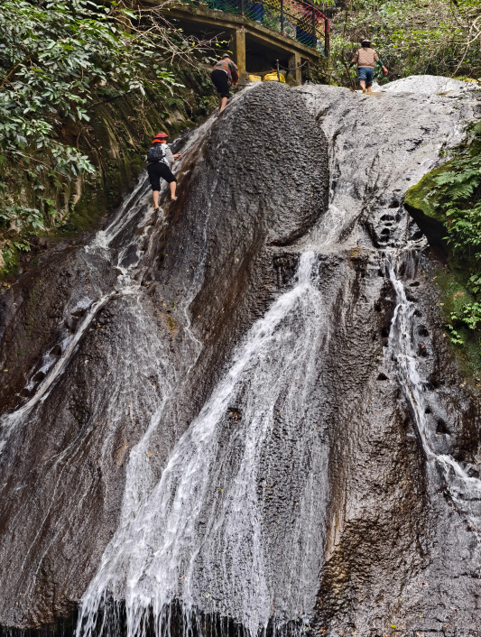 水流轰鸣而下,换上装备体验攀爬瀑布的自然乐趣