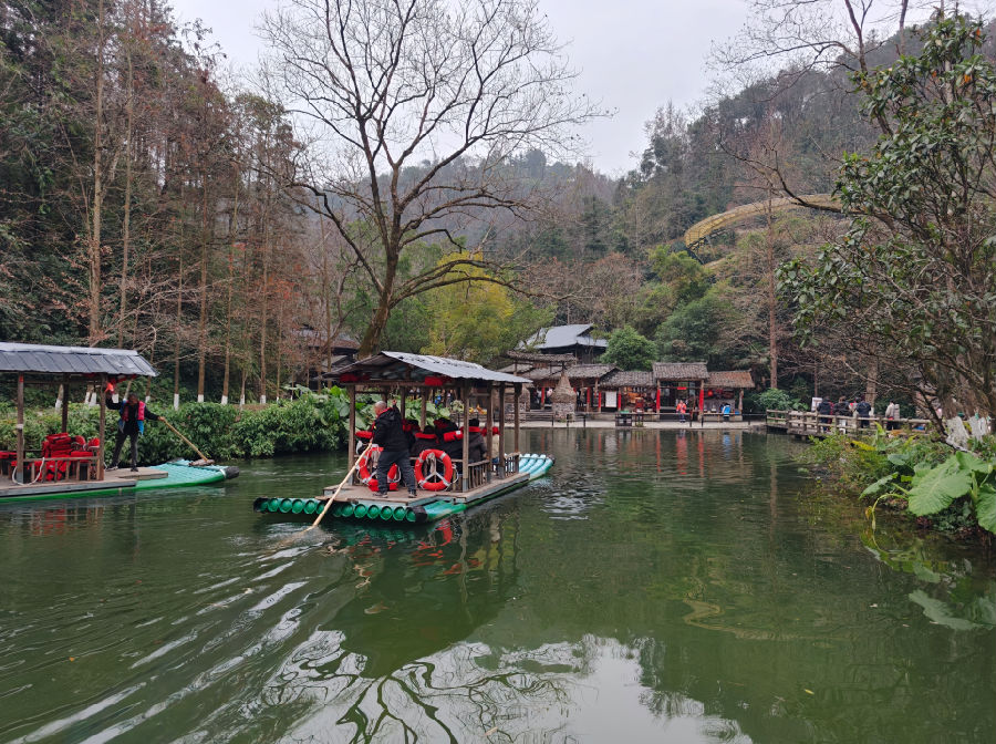 乘一叶竹筏飘荡在碧波之上