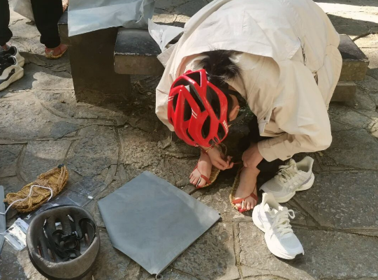 穿草鞋,戴头盔,手握铁链