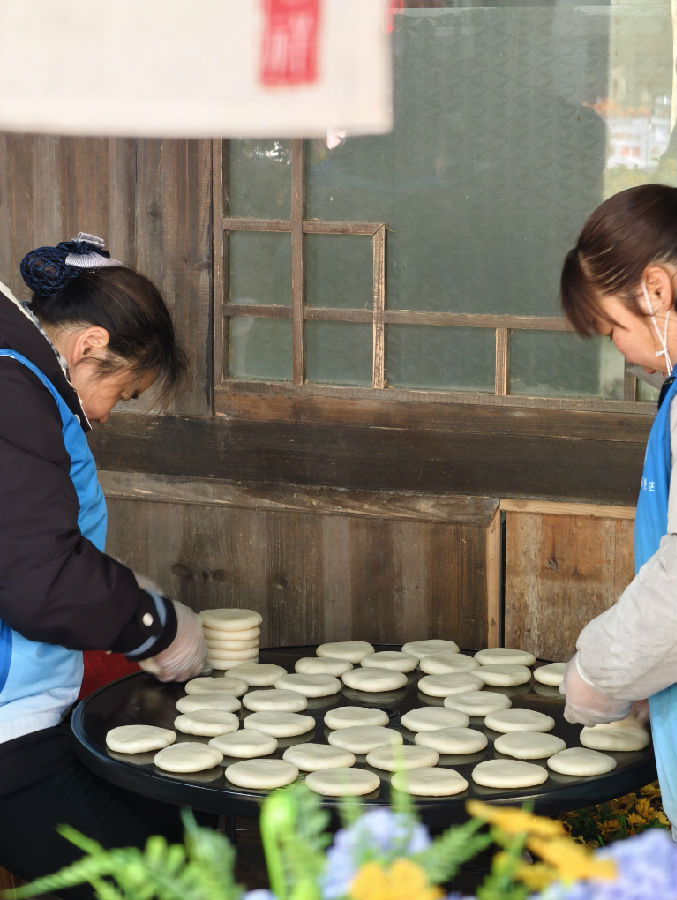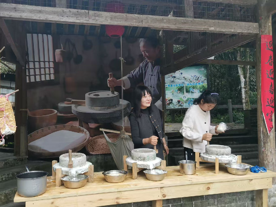 将石臼里的糯米整出黏韧弹牙