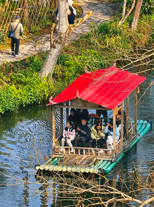 乘一叶竹筏飘荡在碧波之上