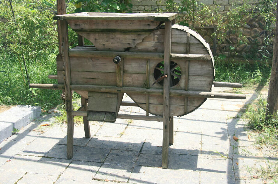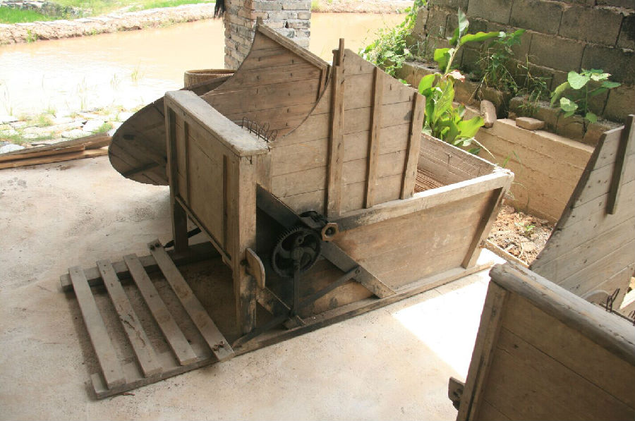 风(谷)车,摇动手柄,带动叶轮,产生风力,除去糙米杂质、瘪粒、秆屑、谷壳等。