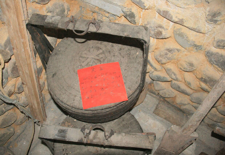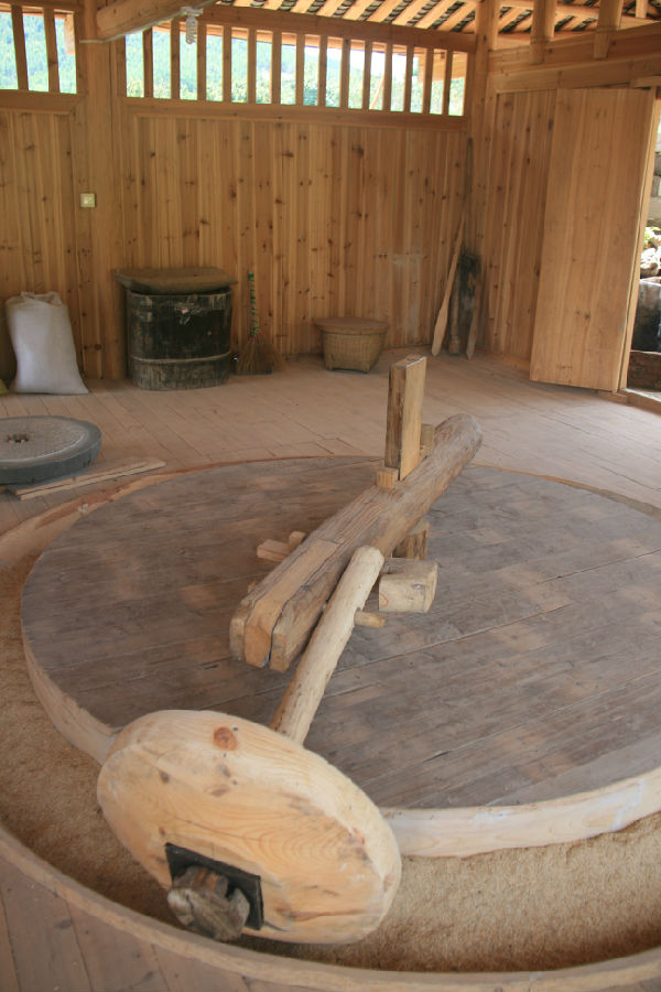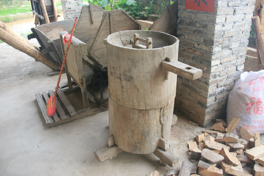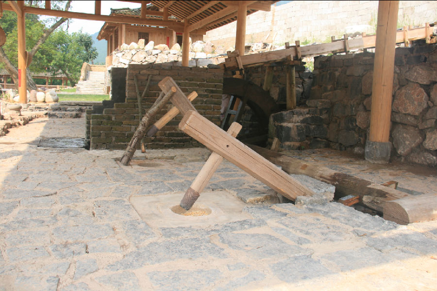 水碓,利用水力带动石(铁)碓,反复敲砸石臼里面的糙米,使其表面糠皮脱落,成为熟米。