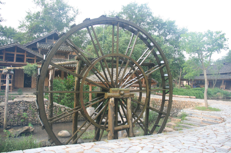 大水车是漓水人家一个显目的农家大型用具,它利用多个臂杆和水戽收集流经的河水。收集起来的河水汇集形成的水力可以用于灌溉、传动等多项用途。漓水人家的大水车既是一个农业用具的展示,也是布坊所需潮湿氛围的原始保湿机,同时是农耕社会一大天然景观。