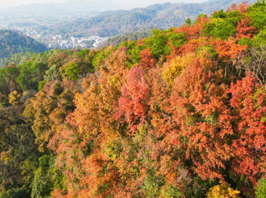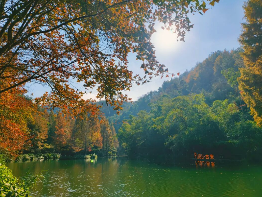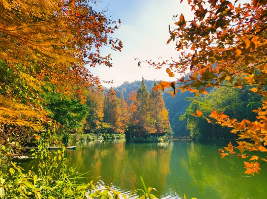 红枫、水杉、乌桕环绕着碧绿的湖水